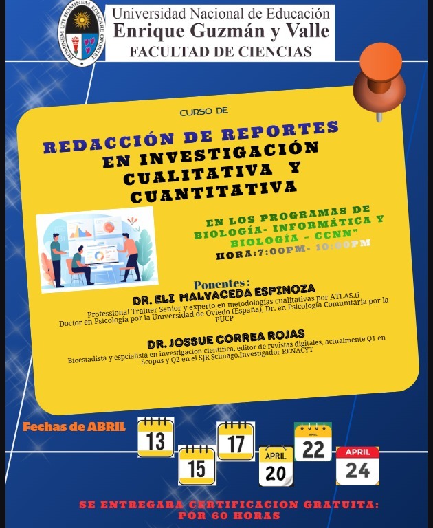 Curso de redacción de reportes en Investigación Cualitativa y Cuantitativa, en los programas de Biología – CCNN y Biología- Informática ▶️ Enlace de las sesiones por Google Meet Haz clic aquí