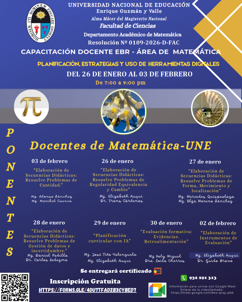 Link de ingreso: https://meet.google.com/pdq-poxv-nxq Ponencia: Planificación y sistema de evaluación para docentes para la evaluación de logros de competencias de los estudiantes del Programa de estudio de matemática e informática e implementación del plan de mejora Articulado (E5, E6, Leer más…