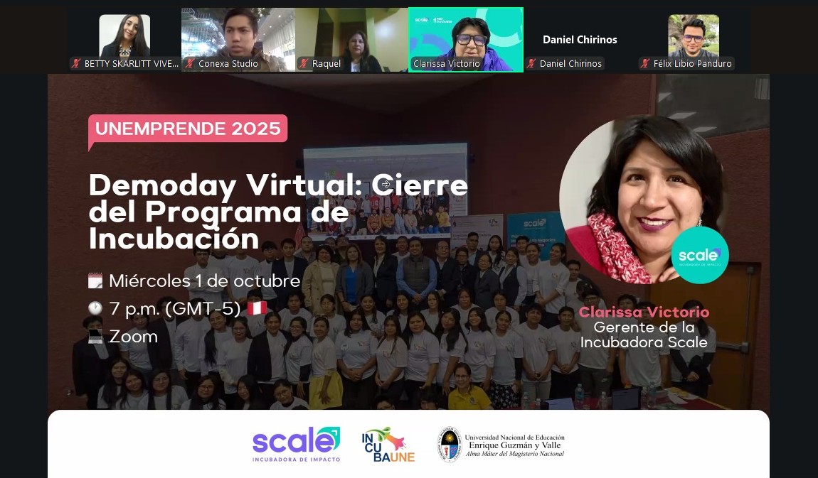 Este jueves 18 de noviembre, la Incubadora de Empresas de la UNE EGyV llevó a cabo el Demo Day del Programa de Incubación 2024, donde los equipos seleccionados del Concurso de Emprendimiento e Innovación UNEMPRENDE 2024, realizaron la presentación de sus propuestas innovadoras ante un jurado evaluador.