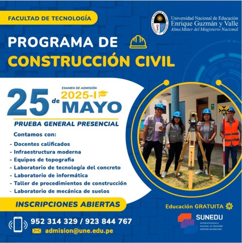 Construcción Civil EL PROGRAMA DIRECCIÓN DEL PROGRAMA PERSONAL DOCENTE LA CARRERA INFORMACIÓN ACADÉMICA LABORATORIO BIBLIOTECA ACREDITACIÓN EVENTOS III Congreso Internacional de Investigación Científica, Humanística y Tecnológica en Educación agosto 26, 2024 Expo Feria por los 201 Aniversario Institucional de la Universidad de Educación Enrique Guzmán y Valle julio 15, 2023 Metaverso Herramientas de Realidad Virtual febrero 14, 2023 Charla virtual “El camino a la sostenibilidad de las ciudades inteligentes – Smart Education” febrero 14, 2023