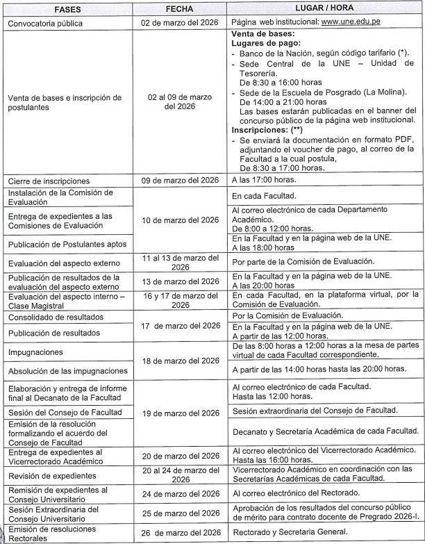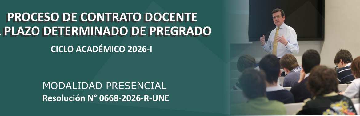 Convocatoria a contrato docente de pregrado 2026-I By userfatecIn ConvocatoriasPosted marzo 4, 2026 Resolución, bases del concurso y plazas vacante Haz clic aquí Modificación de la resolución N° 0668-2026-R-UNE Haz clic aquí Postulantes aptos y no aptos DEPARTAMENTO ACADÉMICO DE ELECTROMOTORES Haz clic aquí DEPARTAMENTO ACADÉMICO DE ELECTRÓNICA Y TELEMÁTICA Haz clic aquí DEPARTAMENTO ACADÉMICO DE DISEÑOS Y CONSTRUCCIONES Haz clic aquí DEPARTAMENTO ACADÉMICO DE METALMECANICA Haz clic aquí DEPARTAMENTO ACADÉMICO DE TECNOLOGÍA DEL VESTIDO, TEXTILES Y ARTES INDUSTRIALES Haz clic aquí Resultados de la evaluación del aspecto externo RESULTADOS DE TODOS LOS DEPARTAMENTOS Haz clic aquí Evaluación externa CRONOGRAMA PARA CLASE MAGISTRAL Haz clic aquí RESULTADOS FINALES CONSOLIDADO DE RESULTADOS Haz clic aquí Share Post Share
