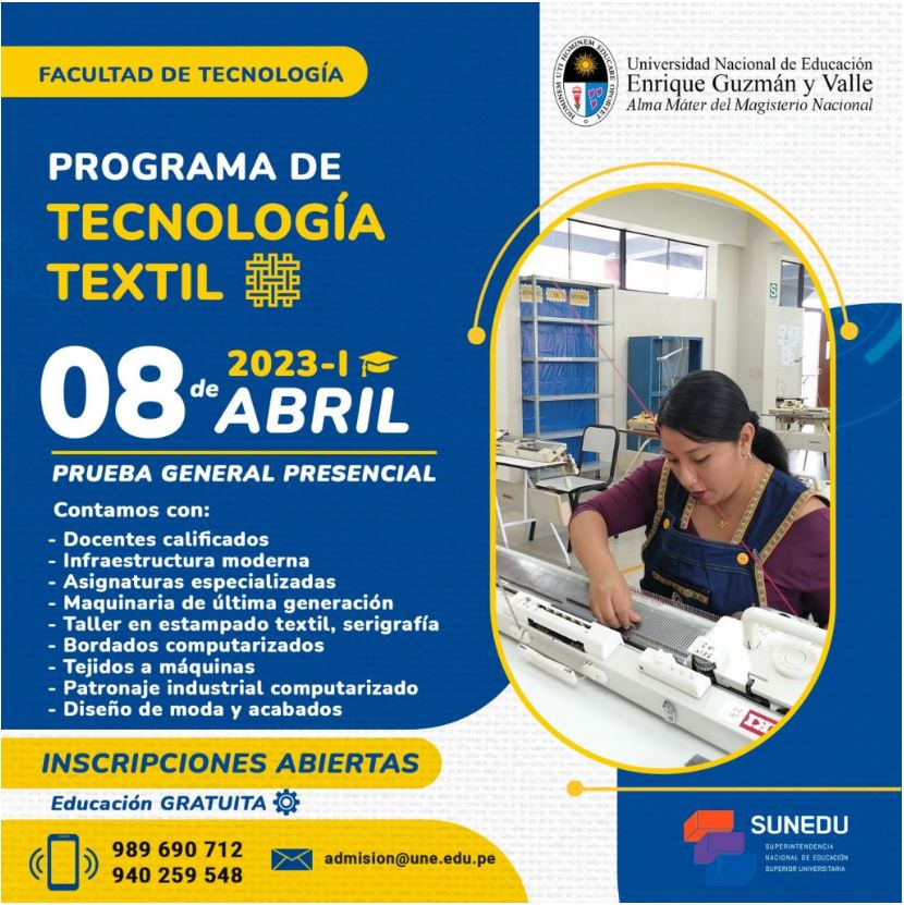 Tecnología Textil EL PROGRAMA DIRECCIÓN DEL PROGRAMA PERSONAL DOCENTE INFORMACIÓN ACADÉMICA LA CARRERA LABORATORIO BIBLIOTECA ACREDITACIÓN EVENTOS III Congreso Internacional de Investigación Científica, Humanística y Tecnológica en Educación agosto 26, 2024 Expo Feria por los 201 Aniversario Institucional de la Universidad de Educación Enrique Guzmán y Valle julio 15, 2023 Metaverso Herramientas de Realidad Virtual febrero 14, 2023 Charla virtual “El camino a la sostenibilidad de las ciudades inteligentes – Smart Education” febrero 14, 2023