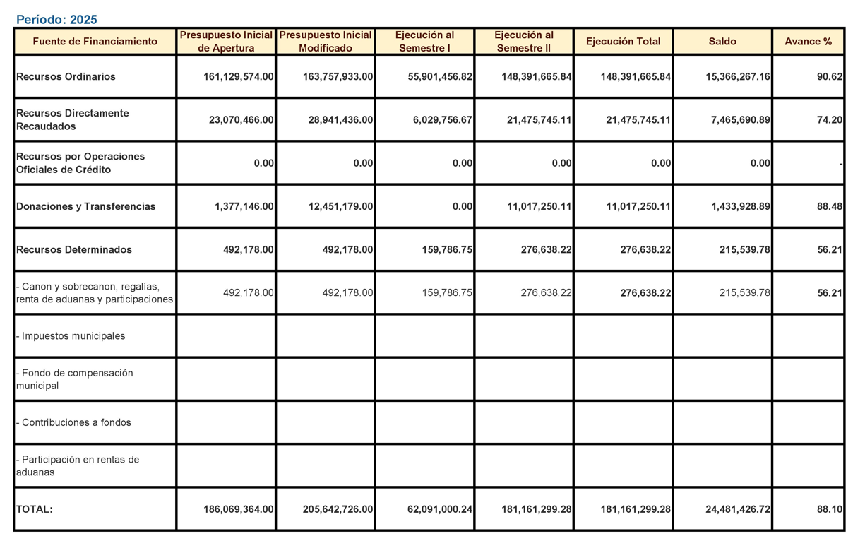 | Fuente de Financiamiento | Presupuesto Inicial de Apertura | Presupuesto Inicial Modificado | Ejecución al Semestre I | Ejecución Total | Saldo | Avance % | ||||||||||||||||||||||||||||||||||||||||||||||||||||||||||||||||||||||||||||||||||||||||||||||||