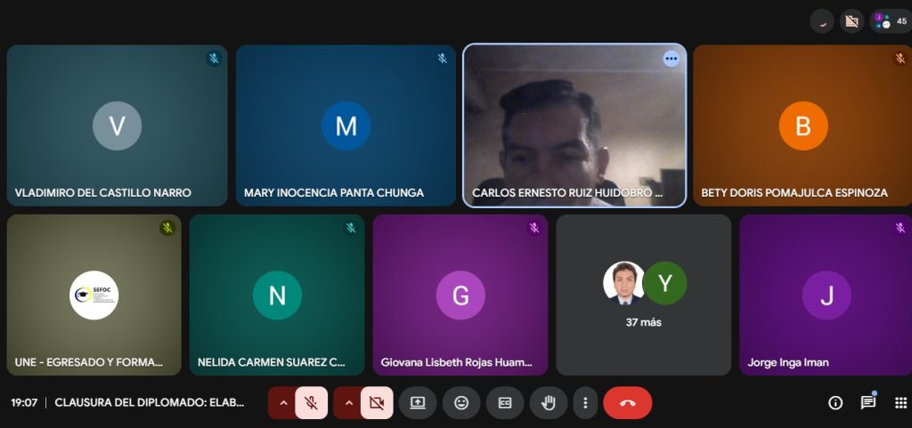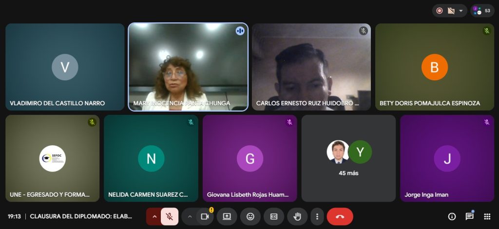 La actividad fue organizada por la Dirección de Seguimiento del Egresado y Formación Continua, a través de la plataforma virtual Meet, y contó también con la participación de la directora, Dra. Mary Panta Chunga; y el ponente, Dr. Raúl Cortez Berrocal; docente de la UNE.