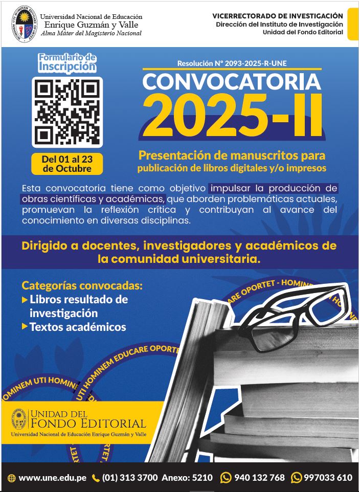 FORMULARIO DE INSCRIPCIÓN: http://bit.ly/3VOqp6o --- PROCEDIMIENTO PARA SOLICITAR PUBLICACIÓN POR EL FONDO EDITORIAL --- DETALLES PARA LA PRESENTACIÓN DEL ARCHIVO (MANUSCRITO) --- ANEXO N° 1 - SOLICITUD --- ANEXO N° 2 - DECLARACIÓN JURADA DE DERECHO DE AUTOR --- ANEXO N° 3 - RESUMEN DE DATOS DE AUTOR (ES) --- ANEXO N° 4 - ESTRUCTURA PARA TEXTOS Total Page Visits: 12 - Today Page Visits: 5