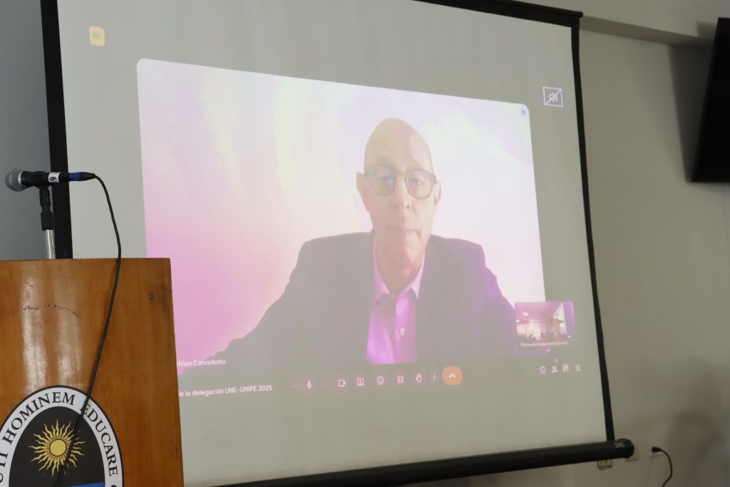 Desde Buenos Aires, el Dr. Adrián Cannellotto, de la Secretaría de Investigación y Posgrado de la UNIPE, se conectó virtualmente para brindar sus palabras de bienvenida, explicar detalles de la estancia académica y augurar el mayor de los éxitos a los jóvenes participantes.