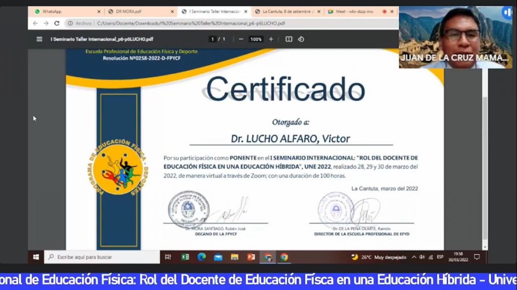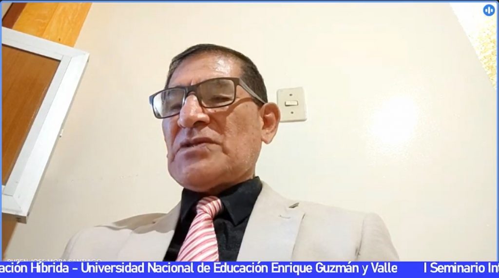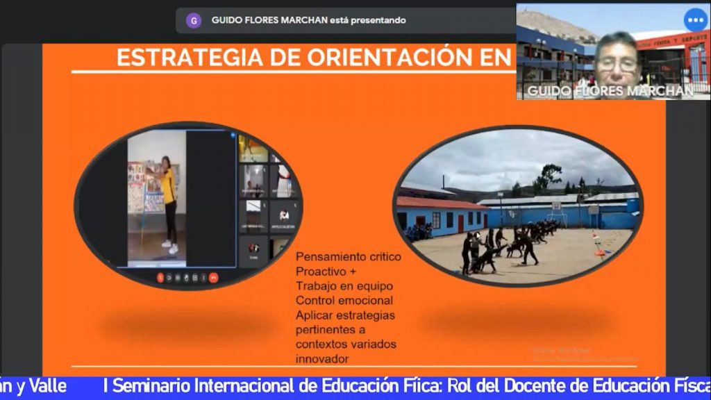 De inmediato, el Dr. Guido Flores Marchand (Perú), docente de la UNE, doctor en Ciencias de la Educación, con maestría en Educación Física, con especialización en currículum por competencias y delegado nacional de la Federación Internacional de Educación Física en el Perú, habló sobre Las prácticas profesionales en una educación híbrida en el contexto de la Educación Física.