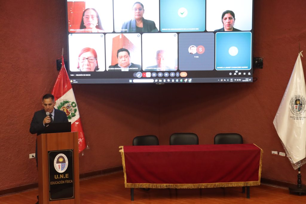 La ceremonia de apertura, realizada de manera híbrida en el auditorio de Educación Física y Deportes, fue presidida por la rectora de la UNE, Dra. Lida Asencios Trujillo, junto al vicerrector académico, Dr. Vladimiro del Castillo Narro; el vicerrector de Investigación; los decanos de las facultades de Tecnología, Dr. Daniel Chirinos Armas, y de Ciencias Empresariales, Dr. Gualberto Guillermo Hurtado Ramos; el director de la Oficina de Calidad, Mtro. Gustavo Vílchez Mendoza; así como presidentes de calidad, docentes y directivos de nuestra casa de estudios.
