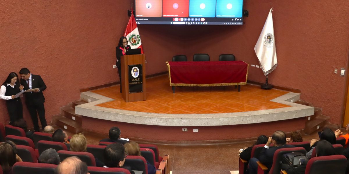 La ceremonia de apertura, realizada de manera híbrida en el auditorio de Educación Física y Deportes, fue presidida por la rectora de la UNE, Dra. Lida Asencios Trujillo, junto al vicerrector académico, Dr. Vladimiro del Castillo Narro; el vicerrector de Investigación; los decanos de las facultades de Tecnología, Dr. Daniel Chirinos Armas, y de Ciencias Empresariales, Dr. Gualberto Guillermo Hurtado Ramos; el director de la Oficina de Calidad, Mtro. Gustavo Vílchez Mendoza; así como presidentes de calidad, docentes y directivos de nuestra casa de estudios.