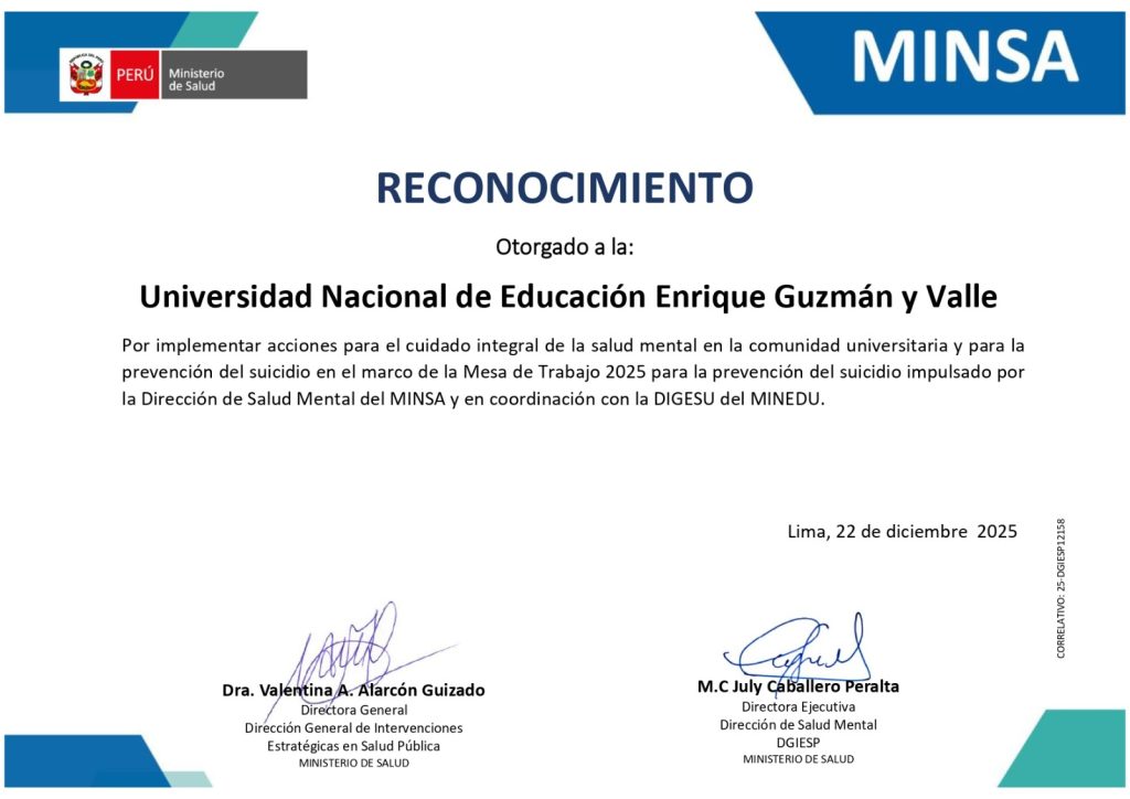 La Universidad Nacional de Educación Enrique Guzmán y Valle recibió el Reconocimiento Interinstitucional 2025, otorgado por el Ministerio de Salud (Minsa), en coordinación con el Ministerio de Educación (Minedu), por la implementación de acciones orientadas al cuidado integral de la salud mental y la prevención del suicidio en la comunidad universitaria cantuteña.