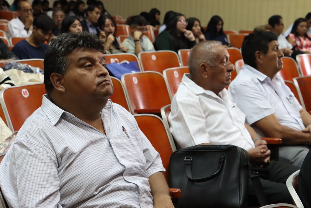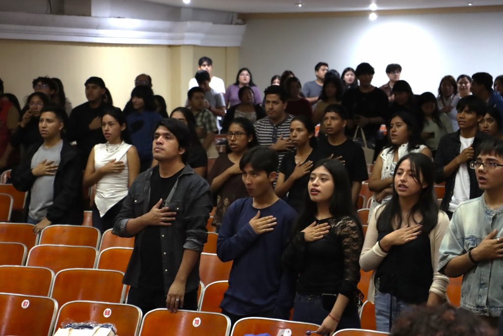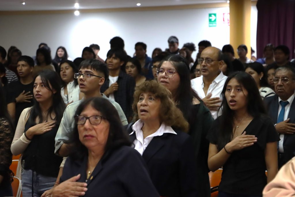 El acto protocolar fue presidido por el rector (i), Dr. Vladimiro del Castillo Narro, quien estuvo acompañado en la mesa de honor por el vicerrector de Investigación, Dr. Daniel Chirinos Maldonado. La ceremonia se inició con la entonación del Himno Nacional del Perú, seguida de las palabras de bienvenida a cargo del Dr. Chirinos Maldonado, quien destacó la importancia de seguir fortaleciendo la formación académica y la investigación en nuestra casa de estudios.