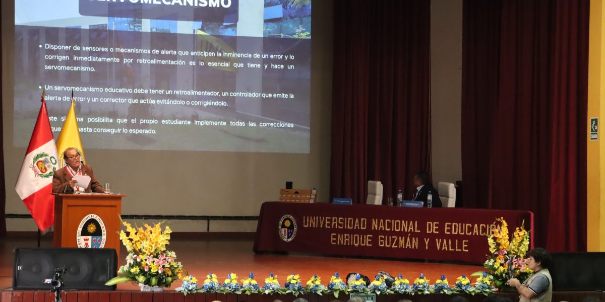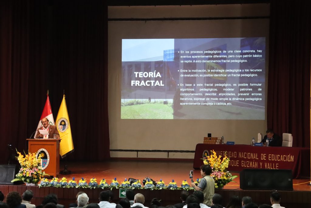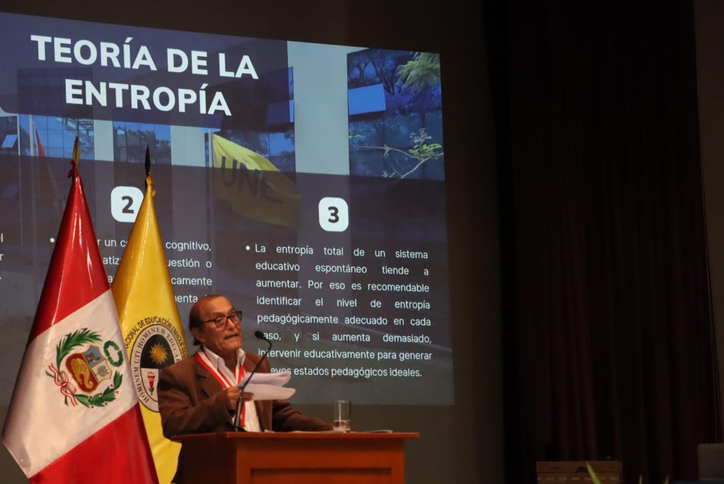 Posteriormente, el rector Vladimiro del Castillo ofreció la exposición magistral titulada Teorías científicas: su extrapolación a contextos educativos, en la que abordó conceptos clave como la entropía, el servomecanismo, la autopoiesis, el fractal, el efecto mariposa, el efecto Mozart, la teoría de la complejidad, del pensamiento humano, la teoría celular, entre otros. En su intervención, concluyó que, “extrapolando recíprocamente ciencia, filosofía y educación, se dispone de una gran alternativa para garantizar un buen nivel de calidad pedagógica-educativa”.