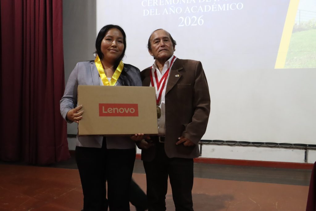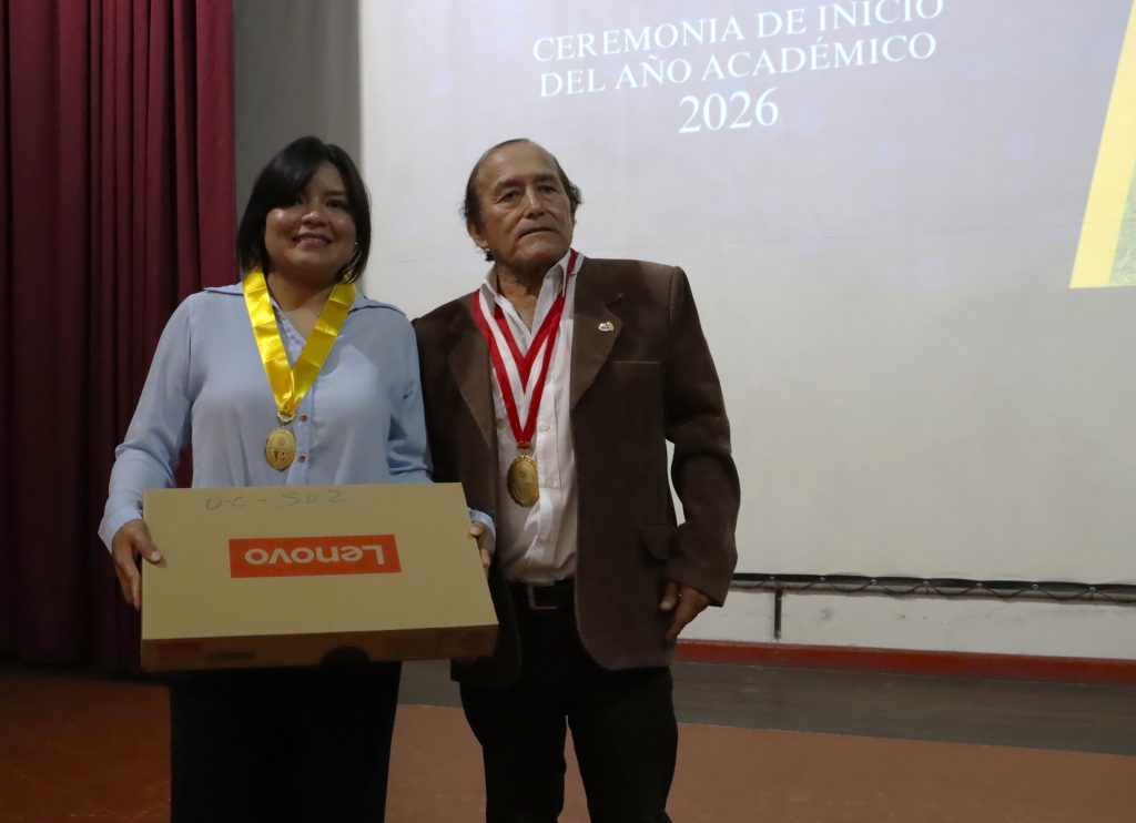 Como parte del programa, se realizó un reconocimiento al mérito académico de los estudiantes que ocuparon los tres primeros puestos del cómputo general del ciclo 2025-II. Los estudiantes distinguidos fueron: Aída Milagros Villacorta Huaylinos (19.43), de la especialidad de Tecnología Textil de la Facultad de Tecnología; Yenny Fernández Coronado (19.35), de Educación Básica Alternativa – Educación Primaria de la Facultad de Pedagogía y Cultura Física; y Diana Esmeralda Auris Santiago (19.30), de la especialidad de Inglés–Francés de la Facultad de Ciencias Sociales y Humanidades. En mérito a su esfuerzo y excelencia, recibieron como premio una laptop.