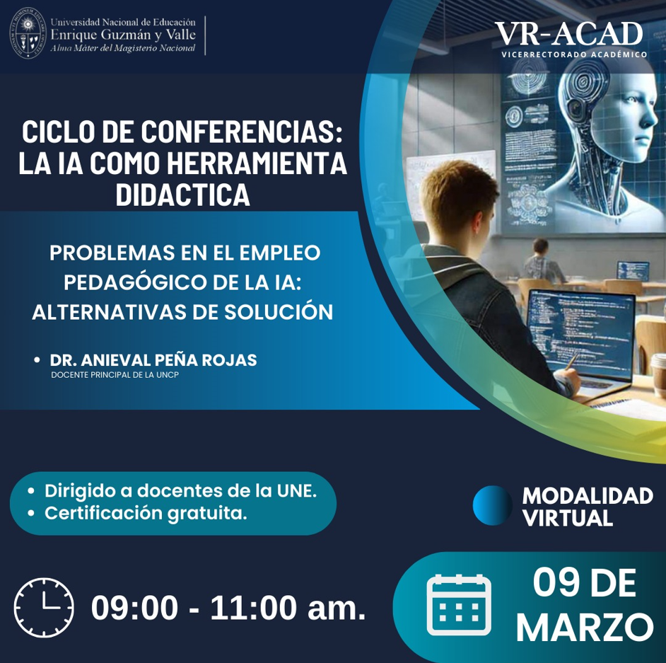 El Vicerrectorado Académico de la Universidad Nacional de Educación Enrique Guzmán y Valle viene desarrollando un ciclo de conferencias de capacitación dirigido a los docentes de nuestra casa de estudios, con el propósito de seguir fortaleciendo sus competencias académicas y pedagógicas mediante la actualización permanente del profesorado, reafirmando así nuestro compromiso institucional con la mejora continua.